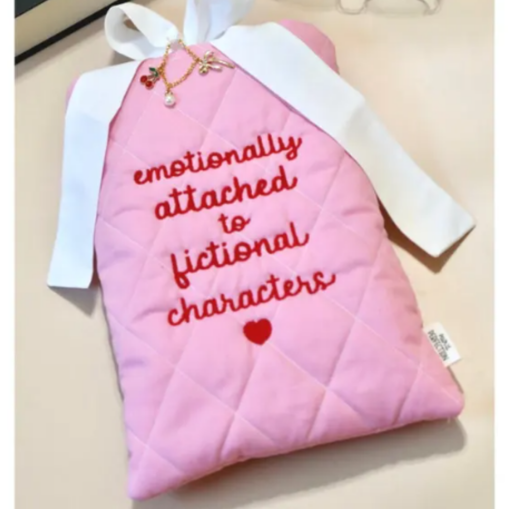 A book sleeve is a thoughtful gift for readers who like to take their books everywhere while keeping them protected in their bag or tote. This soft quilted pink book sleeve with red embroidered “emotionally attached to fictional characters” lettering and a bow detail adds a cute, almost handmade feel that makes it stand out from more basic book accessories. The padded design helps protect paperbacks, hardcovers, or even e-readers from creases and scratches, which makes it especially useful for readers who carry their current read on the go. With its relatable quote and cozy DIY-inspired look, it feels like the kind of bookish accessory that adds personality to a reading routine while still being practical, making it a fun and thoughtful gift for anyone who is proudly attached to their favorite fictional characters.