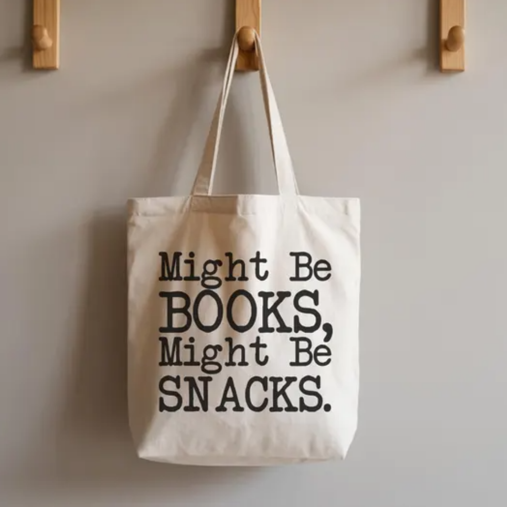 A tote bag is one of the most practical gifts for book lovers because it’s something readers can use every day while carrying their current read wherever they go. Whether it’s a quick trip to the bookstore, running errands, heading to the park for a quiet reading break, or packing a few books for a weekend outing, a sturdy tote always comes in handy. This natural cotton canvas tote with bold black “Might Be Books, Might Be Snacks” lettering adds a fun bookish touch while still keeping that simple, minimalist look that pairs easily with everyday outfits. It’s durable, roomy enough to hold books and daily essentials, and perfect for readers who like bringing their books along wherever the day takes them.