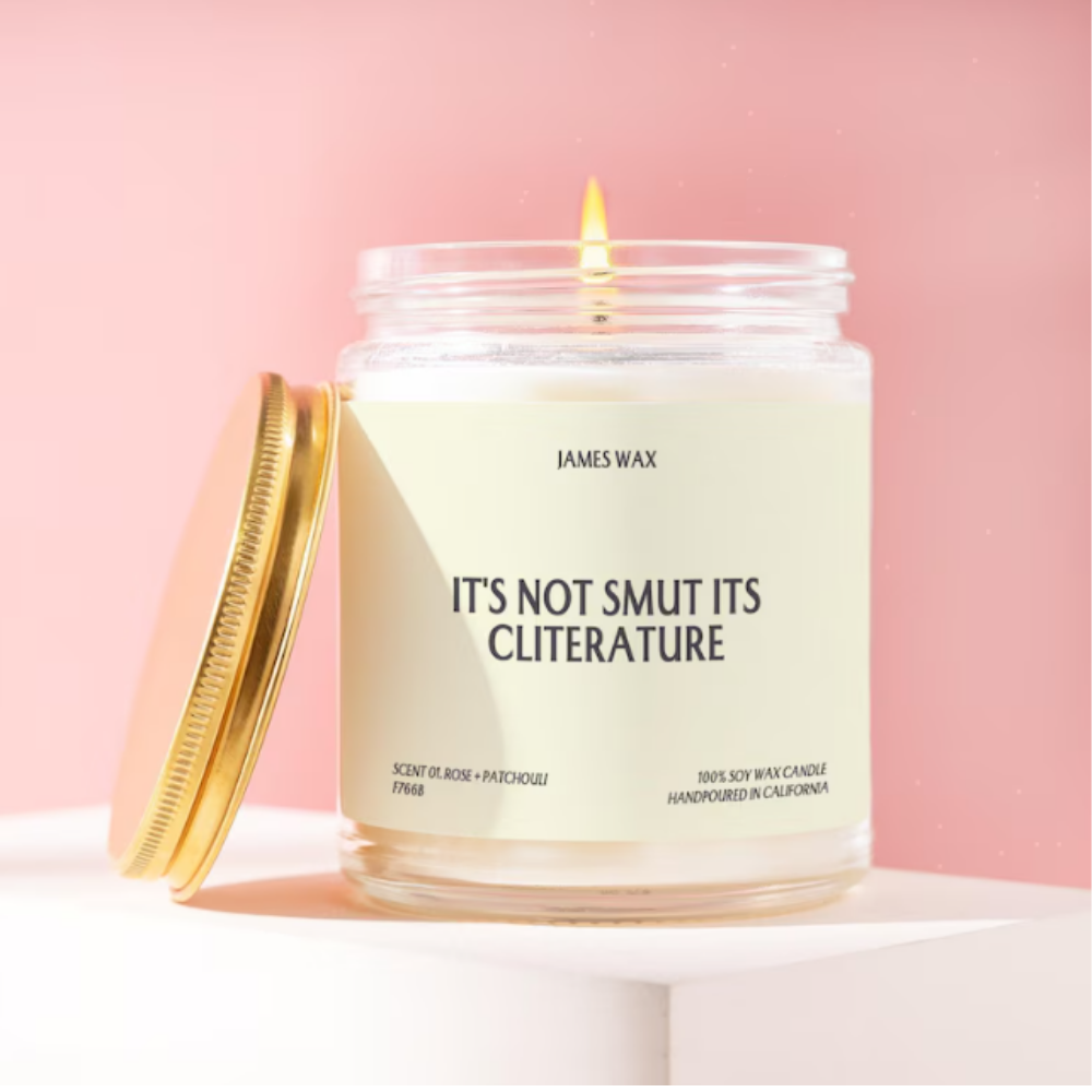 Candles are practically a staple in the bookish lifestyle because they help create that cozy, relaxed atmosphere readers love when settling in with a good book. Lighting a candle while reading can instantly set the mood for a quiet evening, making the whole experience feel a little more intentional and comforting. This cream-colored soy candle in a clear glass jar with a gold lid and the bold label “It’s Not Smut It’s Cliterature” adds a playful and witty touch that many romance and smut readers will instantly relate to. The humorous label makes it a fun conversation piece while still fitting perfectly into a cozy reading nook, making it a great gift for readers who love pairing their books with a candle-lit reading session.