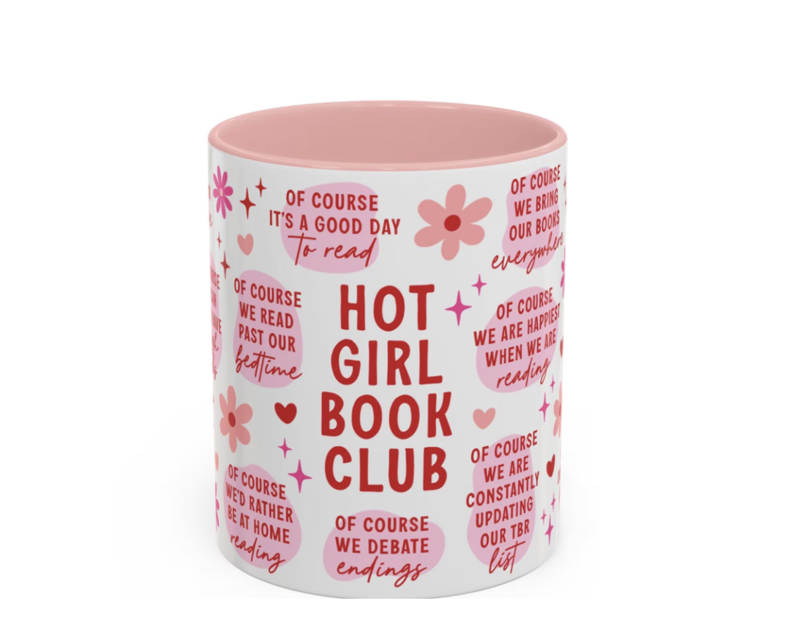 Mugs are one of the go-to gifts for almost any occasion, especially for book lovers. They fit perfectly into the cozy reading lifestyle since many readers love curling up with a book and a warm drink during quiet reading time. This light pink ceramic mug with playful red “Hot Girl Book Club” typography and floral accents adds a fun and confident twist to the usual bookish mug while still feeling cute and aesthetic enough to leave out on a desk or bookshelf. It’s a great gift for girls who embrace the whole “hot girl book club” energy — prioritizing themselves, enjoying their reading time, and treating a quiet night with a good book and a cozy drink like the ultimate form of self-care.