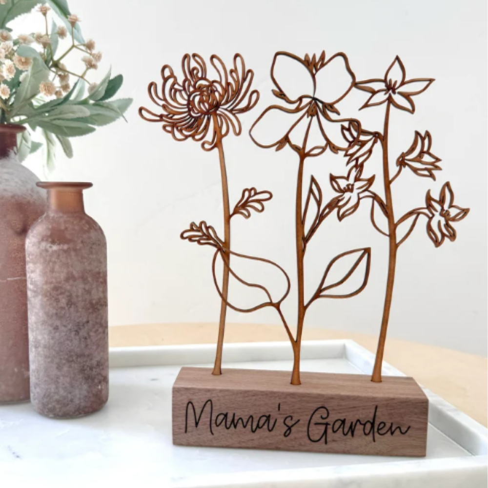 This custom birth flower garden decoration is such a creative way to turn family into a piece of home décor. It features delicate laser-cut metal flowers standing upright in a solid wooden base engraved with “Mama’s Garden,” creating a simple but beautiful display piece. Each flower can represent a different family member’s birth month, turning it into something that feels deeply personal while still looking elegant on a shelf, desk, or entry table. Gifts that combine sentiment with décor always stand out, and this one celebrates family in a way that feels meaningful while also becoming a lasting piece she can proudly display in her home.