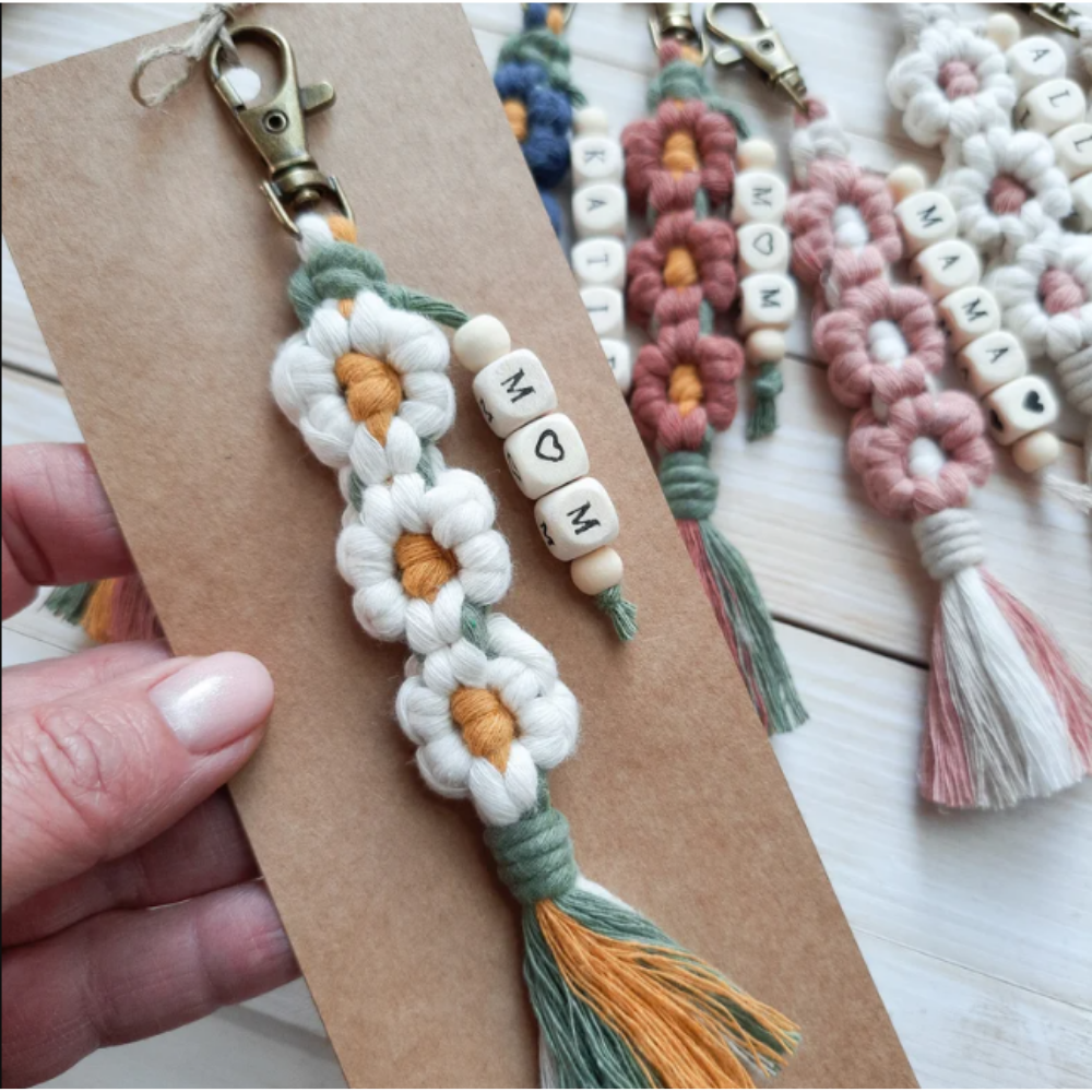 Another gift idea I thought was really sweet is this personalized macrame flower keychain. It’s handmade with soft cotton cord in a daisy-style macrame design, finished with wooden letter beads that spell out a name and a small tassel at the bottom. I love gifts like this because they feel playful, personal, and a little bit different from the usual Mother’s Day options. Adding a name—whether it’s mom, a child’s name, or even a nickname—makes it feel extra meaningful, and the handmade look gives it that cozy DIY touch that Etsy gifts are known for. It’s a small but thoughtful piece she can attach to her keys or bag and carry with her every day.
