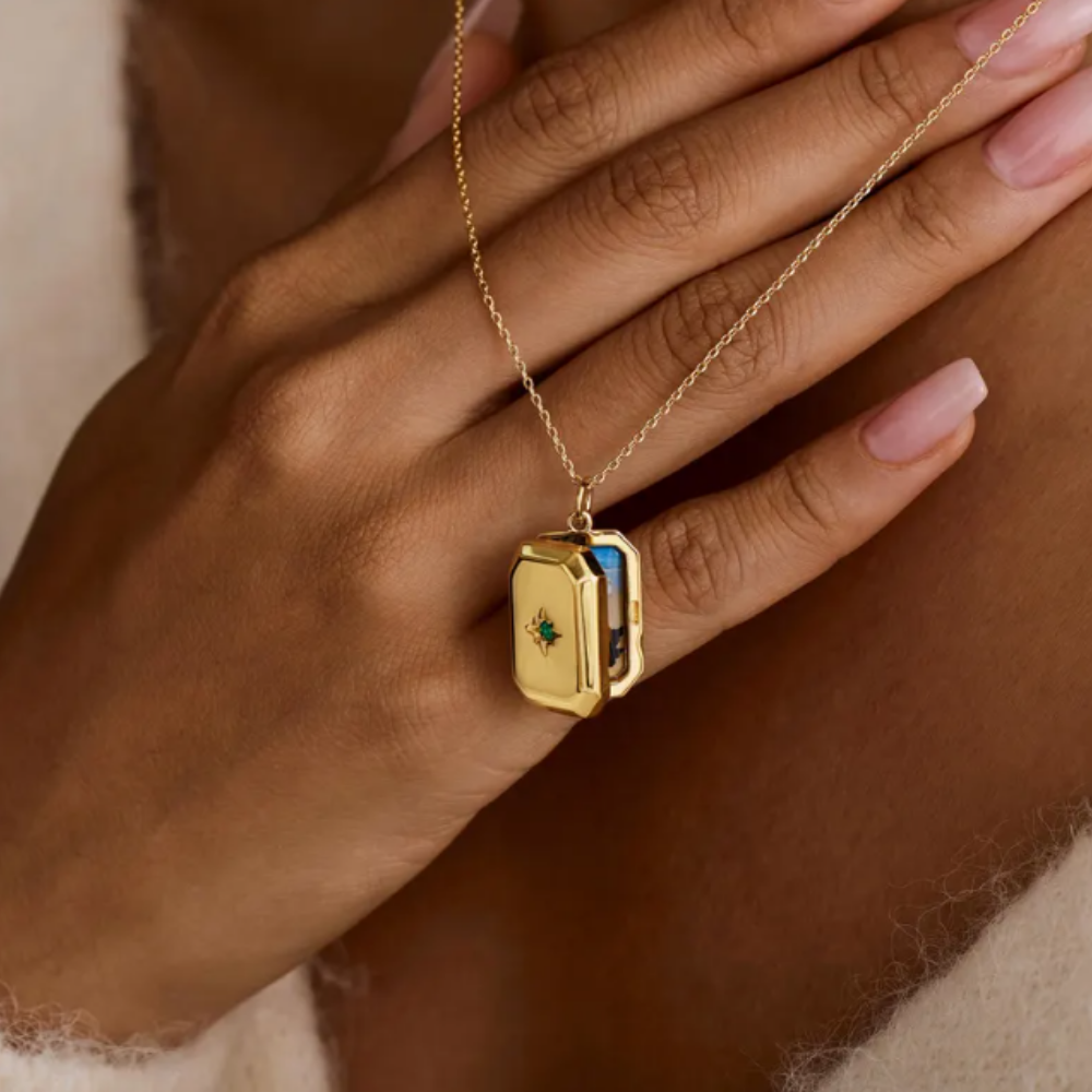 If you’re looking for something a little more sentimental, this custom birthstone locket necklace is such a meaningful option. It features a delicate chain with a small rectangular locket pendant that opens up, with a tiny birthstone set on the front for a subtle sparkle. I’ve always loved the idea of lockets because they feel timeless and personal—you can add a small photo, a name, or even a short message inside, which turns it into a keepsake she can carry close to her heart. It’s one of those gifts that feels incredibly thoughtful without being over the top, and I can easily see it becoming a piece she reaches for often because of the memories attached to it.