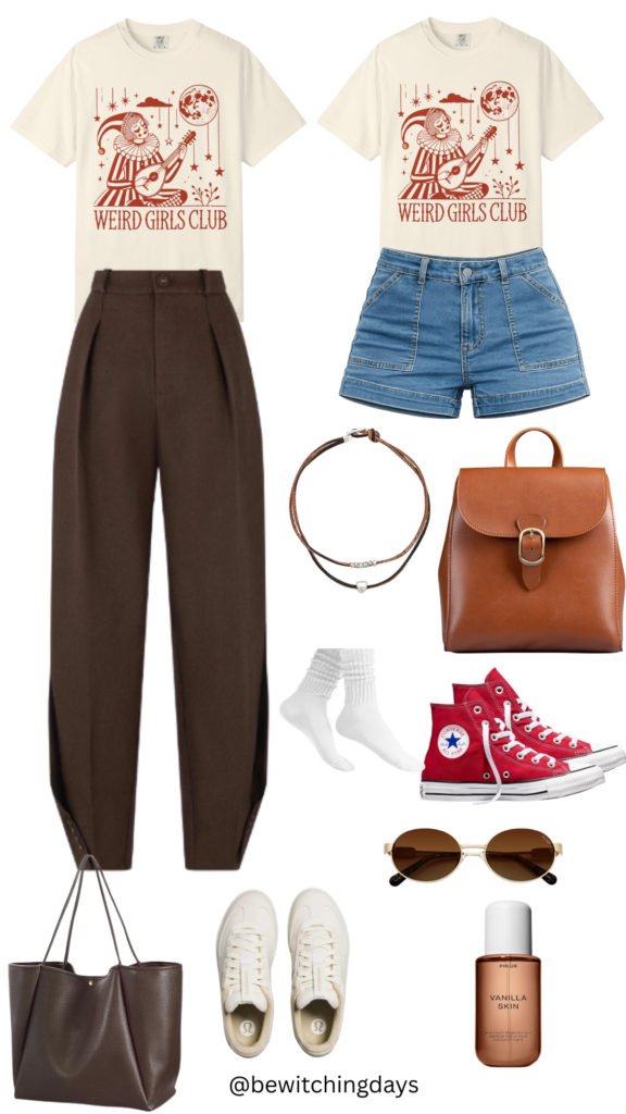The casual version leans into that easy, everyday vibe with denim shorts, sneakers, and simple accessories. It’s comfortable, laid-back, and perfect for running errands, grabbing coffee, or just wanting something cute without overthinking it. On the other hand, I styled the same tee with tailored trousers and more structured pieces to create a look that feels elevated but still relaxed enough to wear to work or dress up when needed.