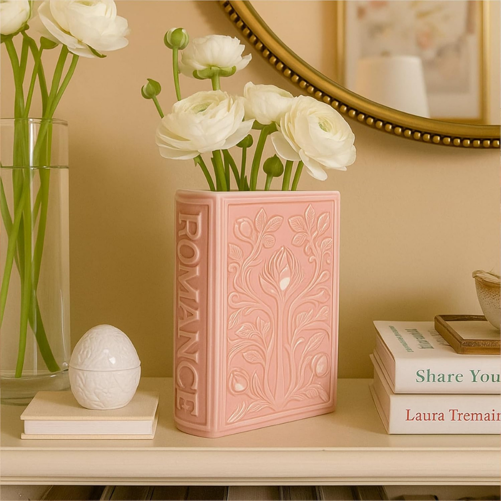 This pink ceramic book-shaped vase is designed to mimic a hardcover book so it looks right at home on a bookshelf, desk, or coffee table and instantly becomes a little conversation starter. It’s also one of those rare decor finds that works that blends in while still feeling special.