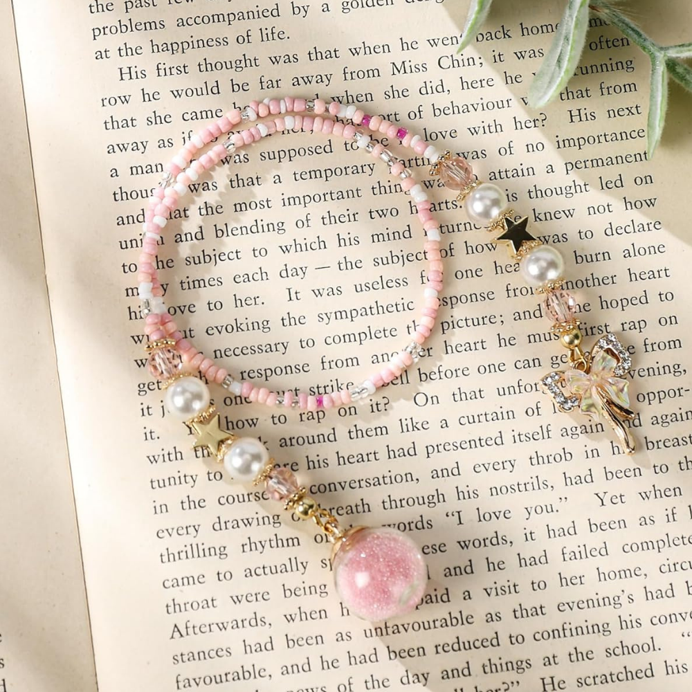 This cute bookmark arrives gift-ready in its own gift box so you’re not scrambling for packaging at the last minute. It’s made with a sturdy bead chain and sparkling Czech crystal beads, which means it’s designed to hold up to everyday reading while still feeling a little luxe and special—exactly what you want in a small present that doesn’t feel forgettable. It’s a pink beaded bookmark with a bow charm on one end and a crystal-style bead on the other.